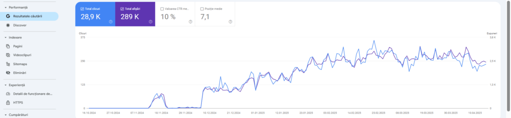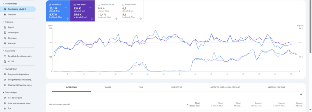 - Monitorizare atentă și ajustări continue – Se analizează în detaliu modul în care motoarele de căutare răspund la modificările implementate și se fac ajustări acolo unde este necesar. Datele din Google Search Console sunt urmărite îndeaproape pentru a identifica tendințele emergente și a adapta strategia în consecință. Această monitorizare nu se limitează doar la urmărirea pozițiilor în SERP. Se analizează și comportamentul utilizatorilor pe site, cum ar fi timpul petrecut pe pagină sau rata de bounce, pentru a înțelege cum interacționează vizitatorii cu conținutul nou creat.